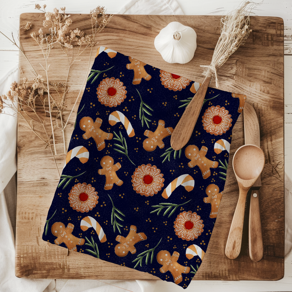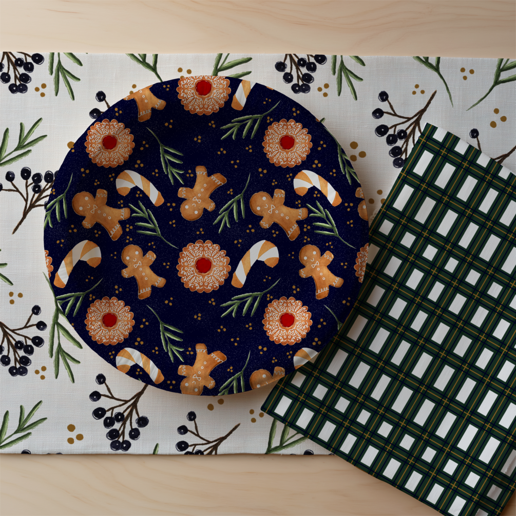 A holiday cookie seamless pattern, featuring hand painted gingerbread cookies. Painted with Mission Gold watercolors on Arches 100% cotton watercolor paper.