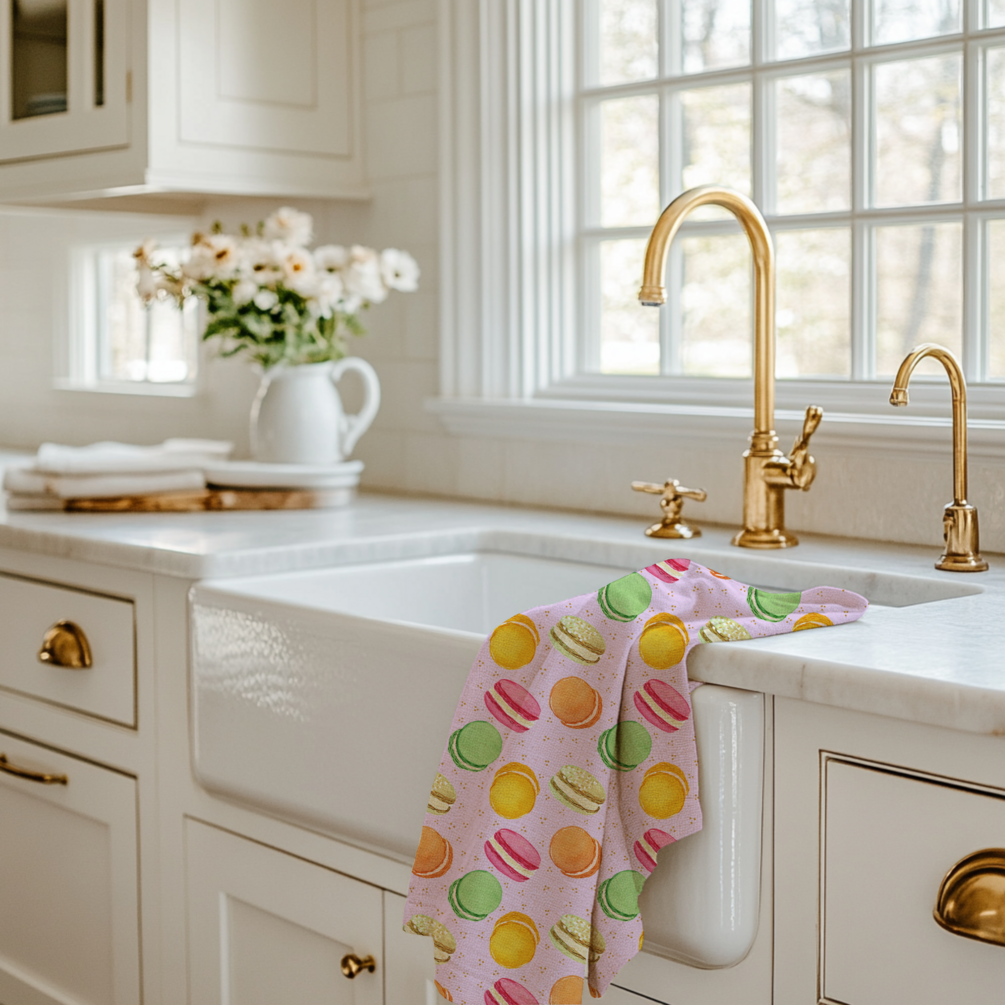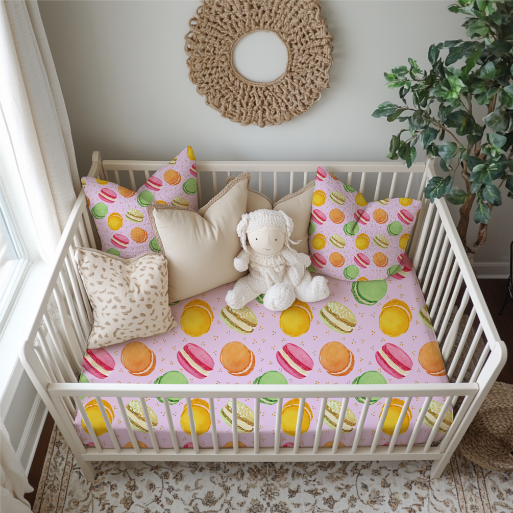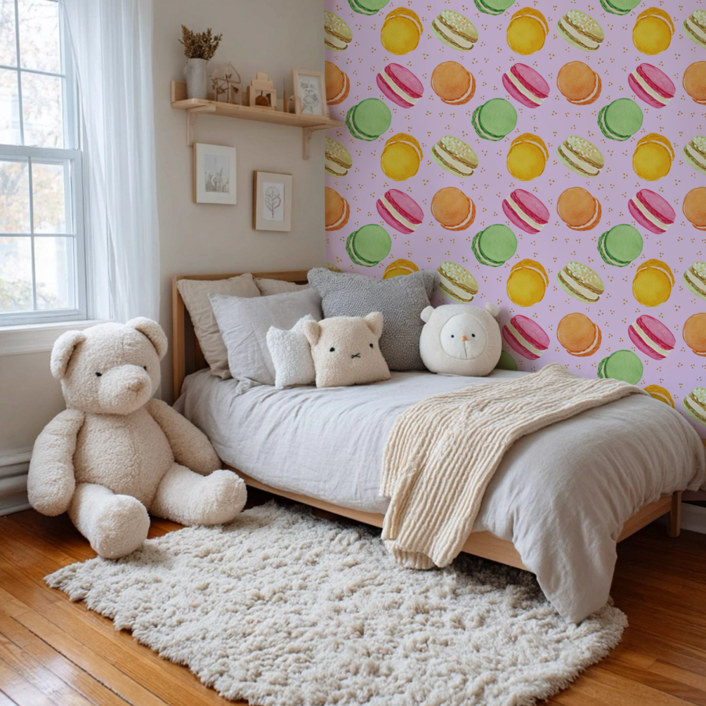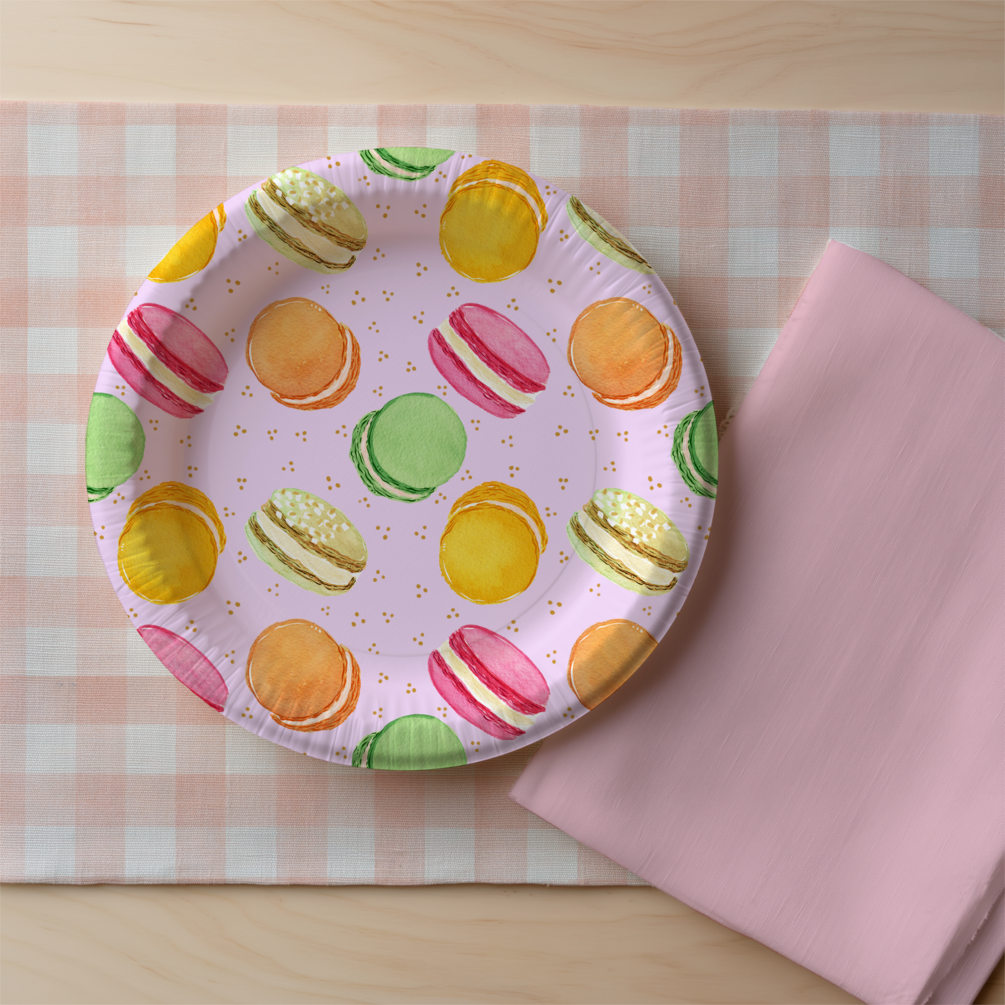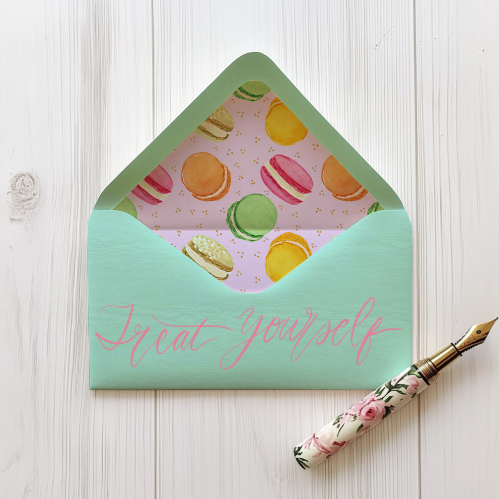 A sweet treat seamless pattern, featuring hand painted macarons. Painted with Holbein, Winsor & Newton, and Gansai Tambi metallic watercolors on Arches 100% cotton watercolor paper.